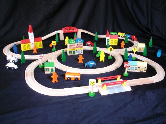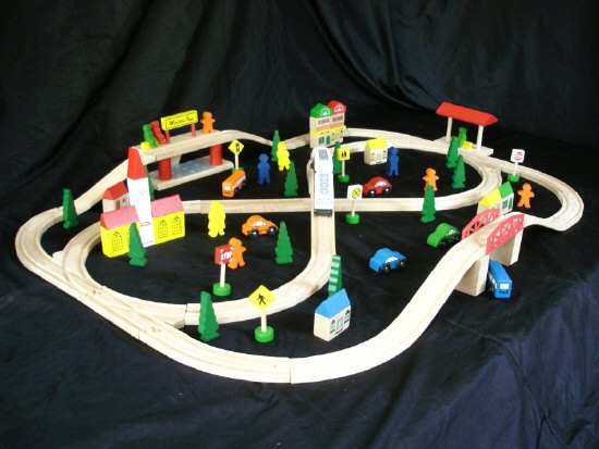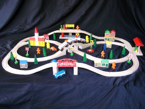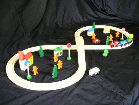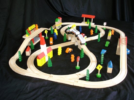 Eine Holzeisenbahn gehört seit jeher zu den Träumen von unseren Kinder. Die Schienen sind griffig für Kinderhände, robust und über Steckverbindungen leicht aneinander zu reihen. Sehr schnell lässt sich ein geschlossener Schienenkreis legen.